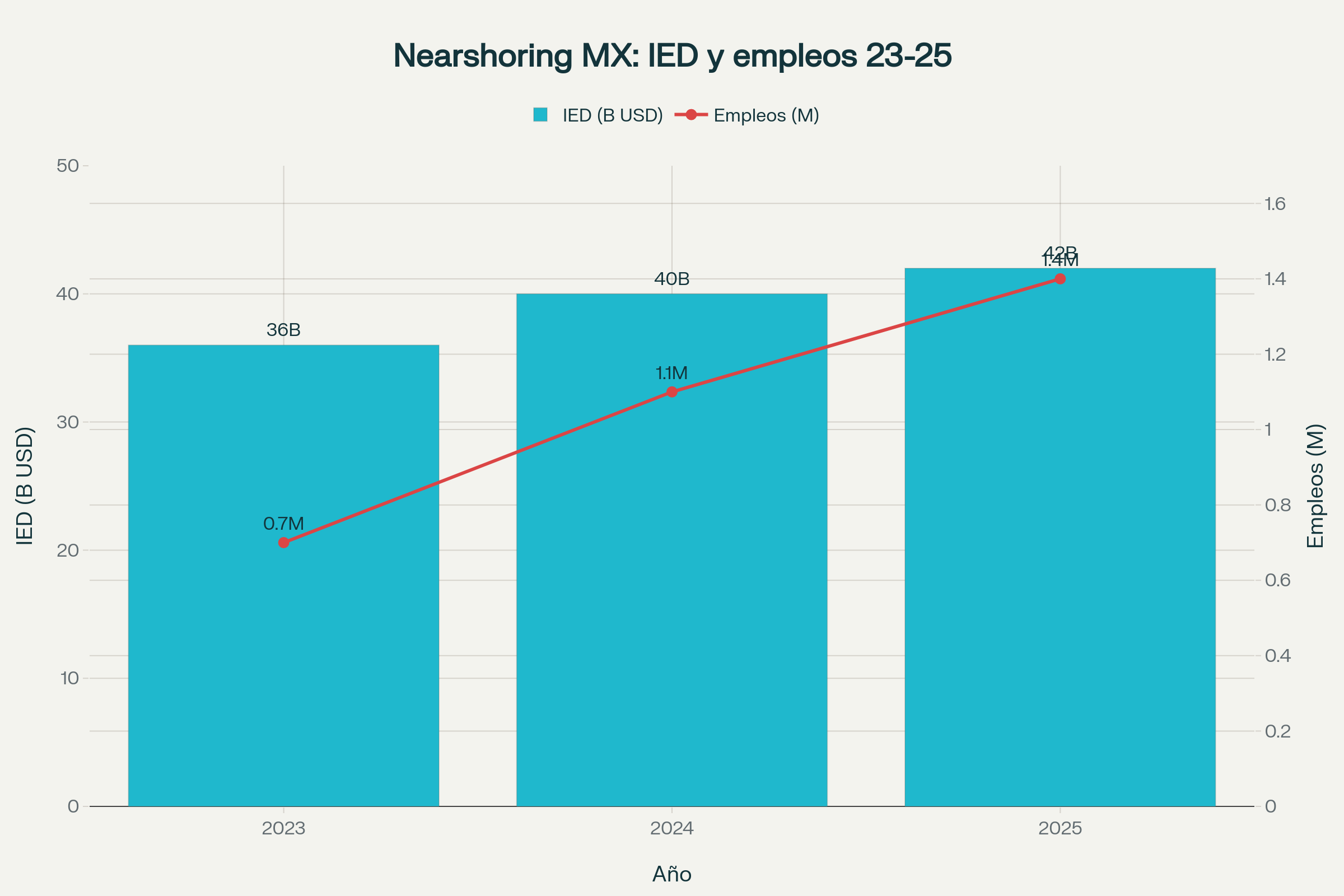 En 2025, la inversión extranjera directa (IED) ligada al nearshoring reportó cifras récord: más de 36 mil millones de dólares recibidos en 2023 y una tendencia ascendente durante 2024 y lo que va de 2025, según la Secretaría de Economía y BBVA Research.